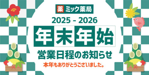 店舗情報 2025-2026ミック薬局年末年始《営業日程》のご案内2025.12.17ミック薬局年末年始《営業日程》をご確認ください 本年もミック薬局をご愛顧いただき誠にありがとうございました。皆様お揃いでよい年をお迎えくださいますよう、心からお祈り申し上げます。 ミック薬局の年末年始の営業を下記の通りと...